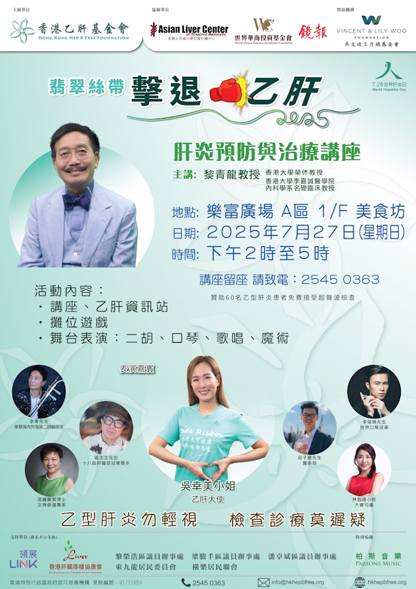 香港乙肝基金會於今年7月13日主辦「翡翠絲帶擊退乙肝晚會」邀請食物及衛生局副局長徐德義醫生、衛生署控制病毒性肝炎辦公室顧問林潔宜醫生等主禮、藝人羅家英及香港乙肝基金會會長兼香港大學內科及肝臟科講座教授黎青龍教授,聯同基金會一眾委員及嘉賓一同主持「翡翠絲帶擊退乙肝」啟動儀式,象徵齊心擊退乙肝。